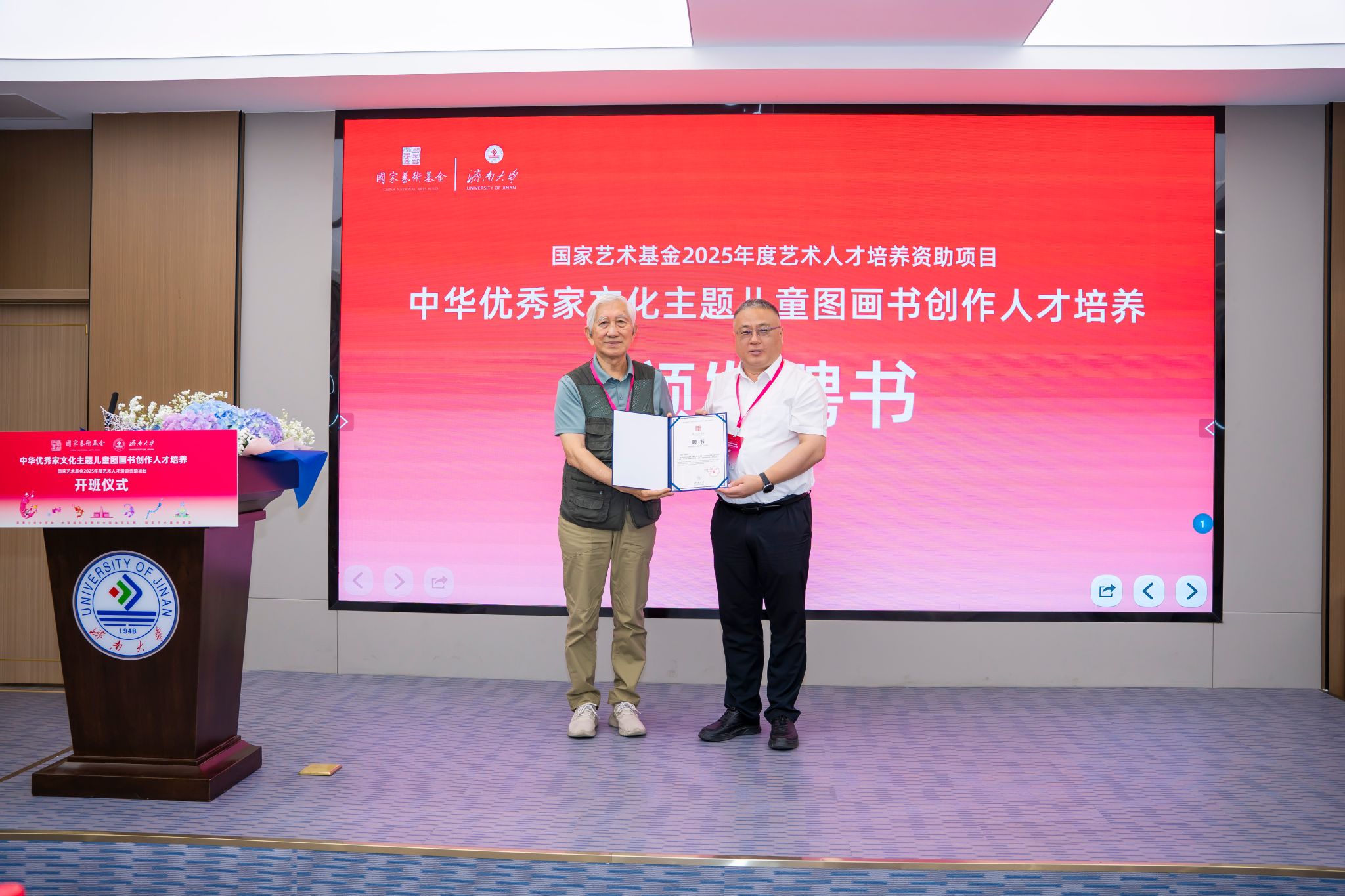 7月1日,国家艺术基金2025年度艺术人才培养资助项目“中华优秀家文化主题儿童图画书创作人才培养”开班仪式在万象城awcsport官网隆重举行。清华大学首批文科资深教授柳冠中,山东省艺术研究院专职副书记、国家艺术基金山东项目管理办公室主任李磊,山东省文艺评论家协会副主席、秘书长王之明,山东师范大学赫尔岑国际艺术学院院长刘东峰,山东工艺美术学院教务处处长顾群业。万象城awcsport官网党委常委、副校长黄加栋,党委常委、宣传部部长卢旺,社科处、合作发展处、万象城awcsport官网相关负责人,项目教师授课代表及项目学员们参加本次仪式。开班仪式由万象城awcsport官网万象城awcsport官网副院长杨海波主持。