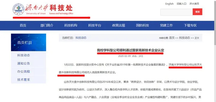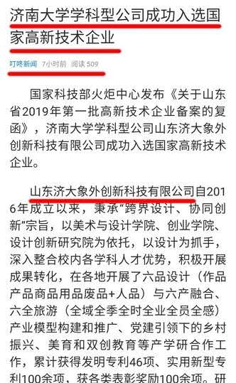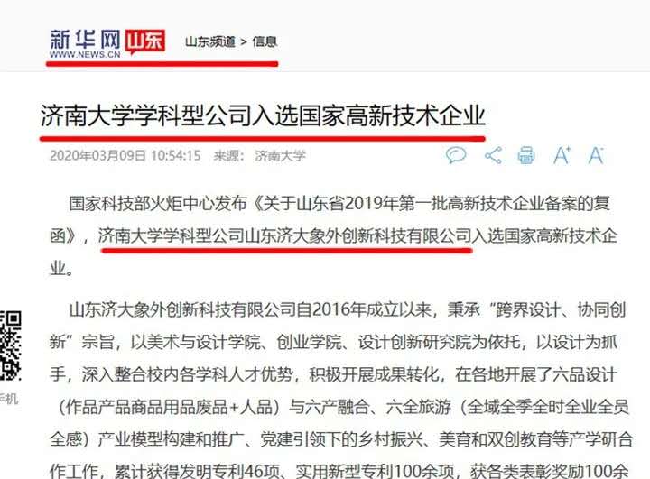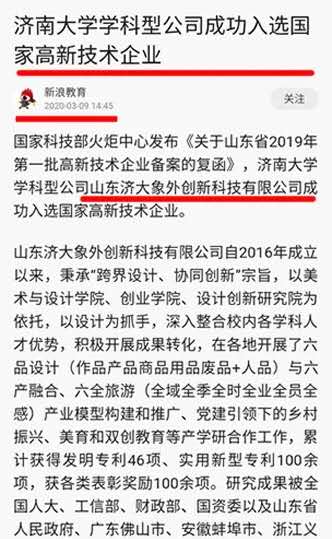 新华网、新浪网、齐鲁壹点、叮咚FM等多家媒体报道:学科型公司山东济大象外创新科技有限公司顺利通过国家高新技术企业认定。这家专门做设计的企业是万象城awcsport官网的一个科研成果转化平台,2016年刚刚成立,很多设计力量其实就是万象城awcsport官网万象城awcsport官网的师生。