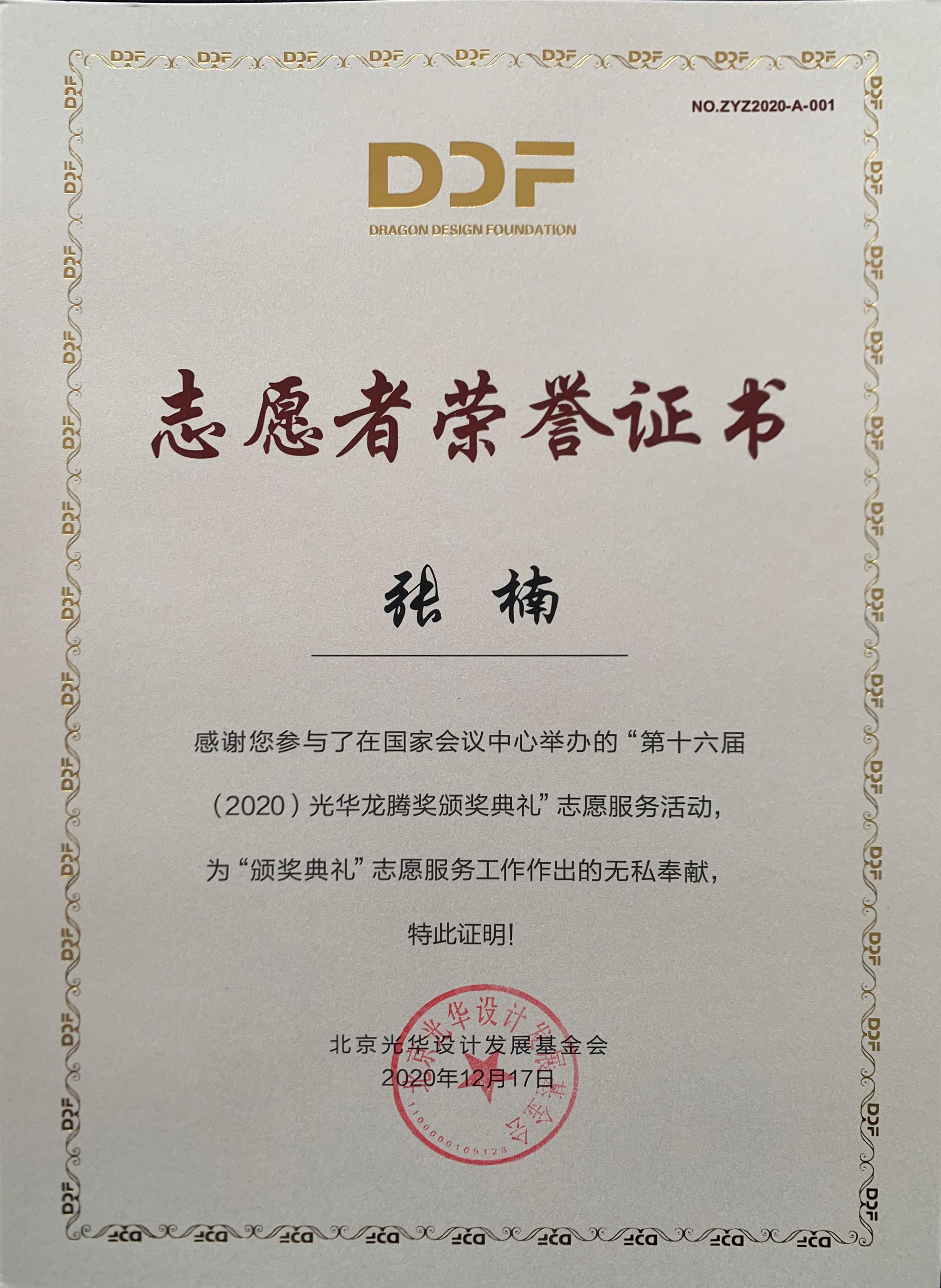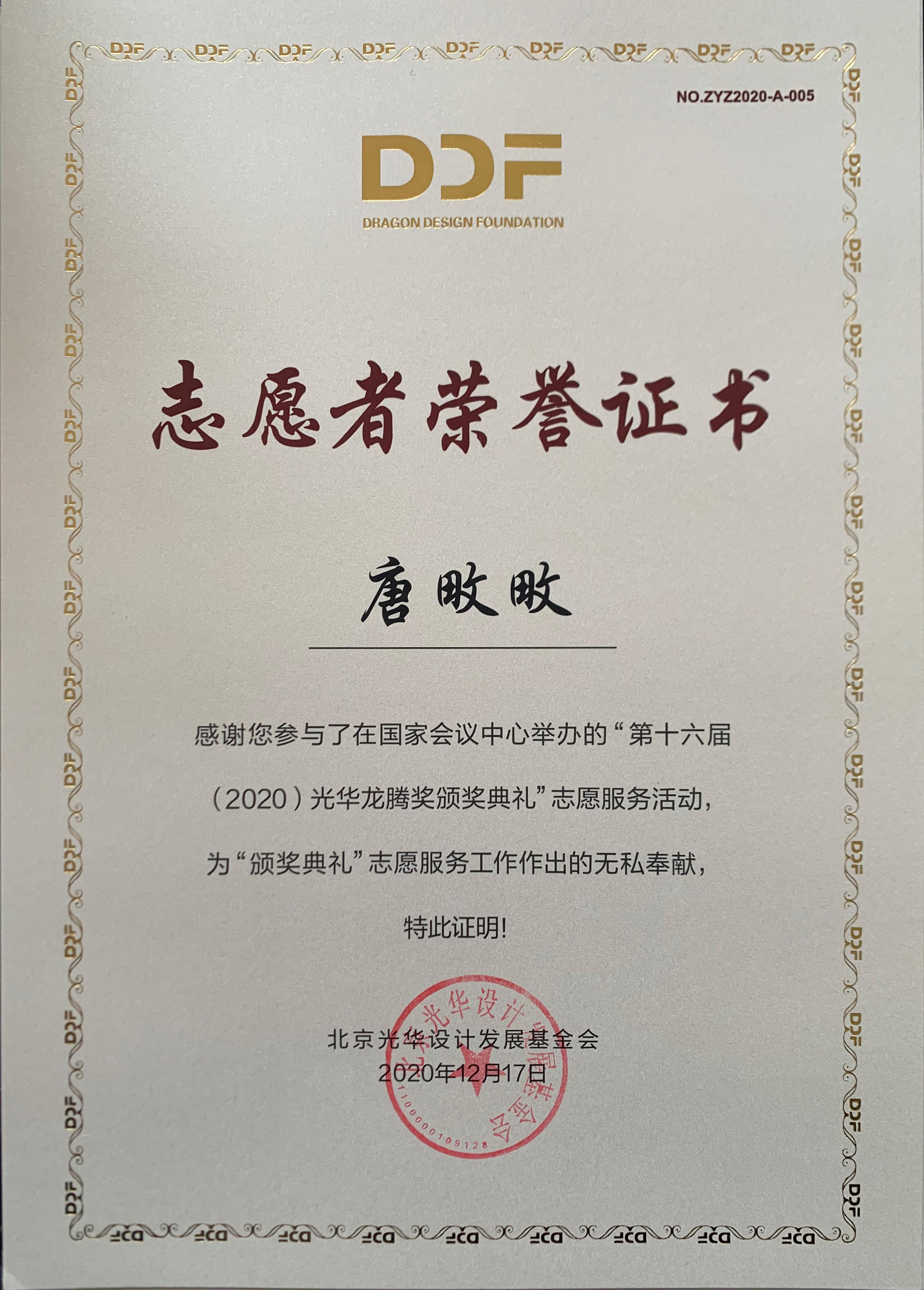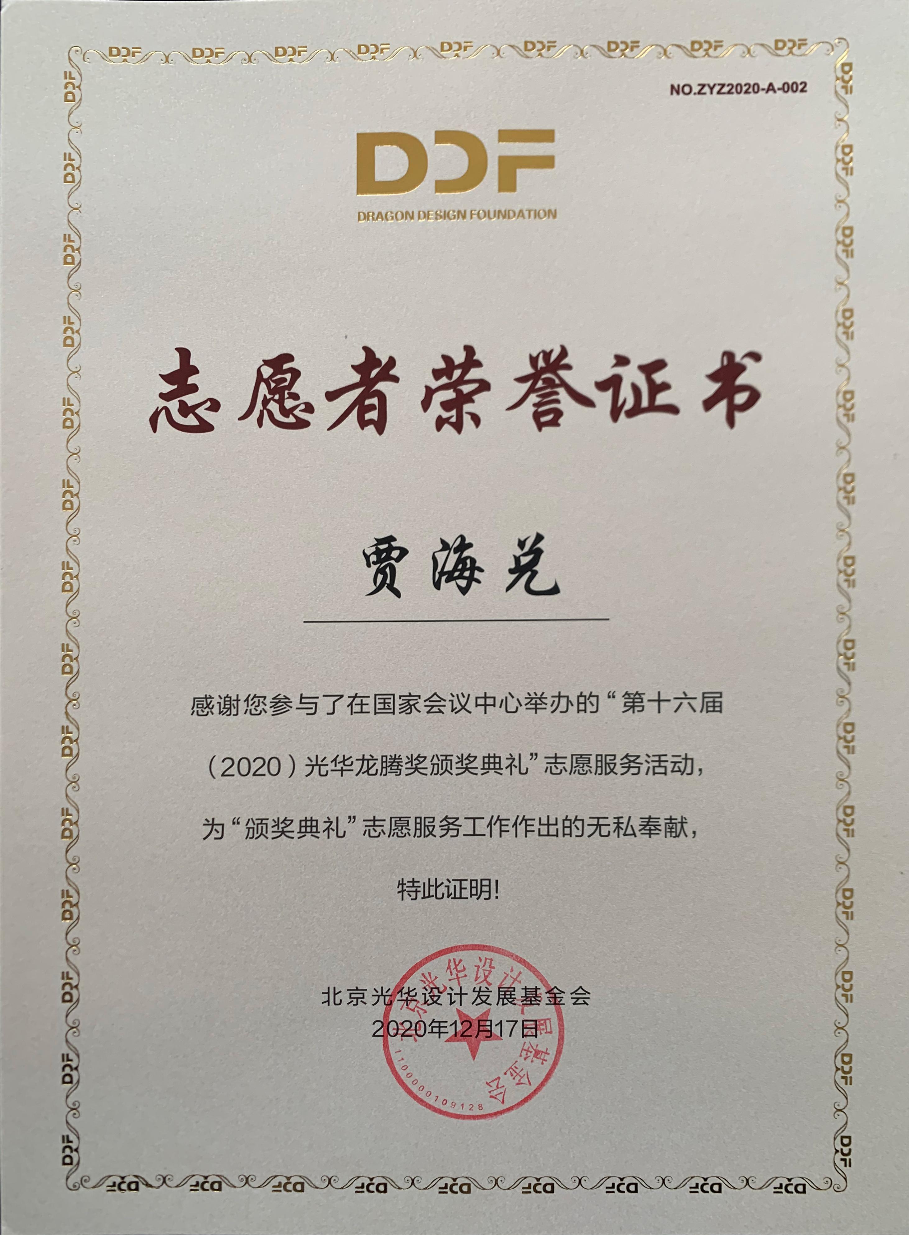 2020年12月17日上午,第十六届(2020)光华龙腾奖颁奖典礼在国家会议中心隆重举行。万象城awcsport官网万象城awcsport官网荣誉院长柳冠中被授予“光华龙腾奖委员会荣誉主席”称号。万象城awcsport官网杨海波老师指导的“光华-万象城awcsport官网志愿服务队”为北京光华设计发展基金会相关活动作了大量设计志愿服务工作,得到组委会高度肯定并获颁志愿者荣誉证书。