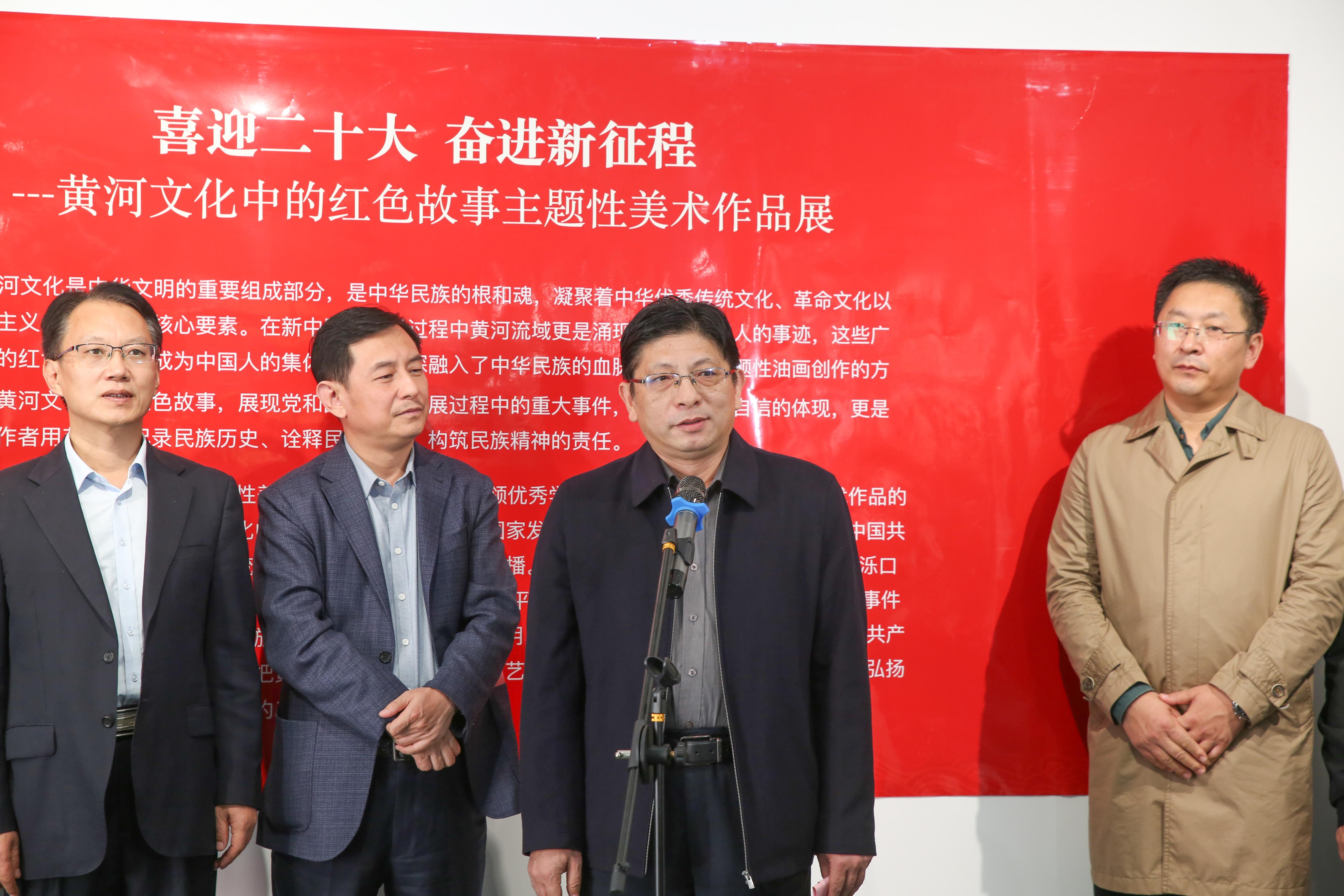 10月14日下午,万象城awcsport官网美术学院“喜迎二十大奋进新征程—黄河文化中的红色故事”主题性美术作品展在第十教学楼艺美空间隆重开幕。万象城awcsport官网党委副书记杨景波,党委常委、党委宣传部部长贾海宁,合作发展处处长、省部共建办公室主任卢旺,团委书记胡春毅,党委学生工作部副部长胡春雷等领导出席活动,美术学院领导班子全体成员以及部分师生代表参加了开幕式。开幕式由美术学院常务副院长陶国平主持。