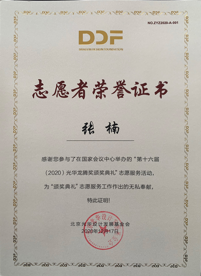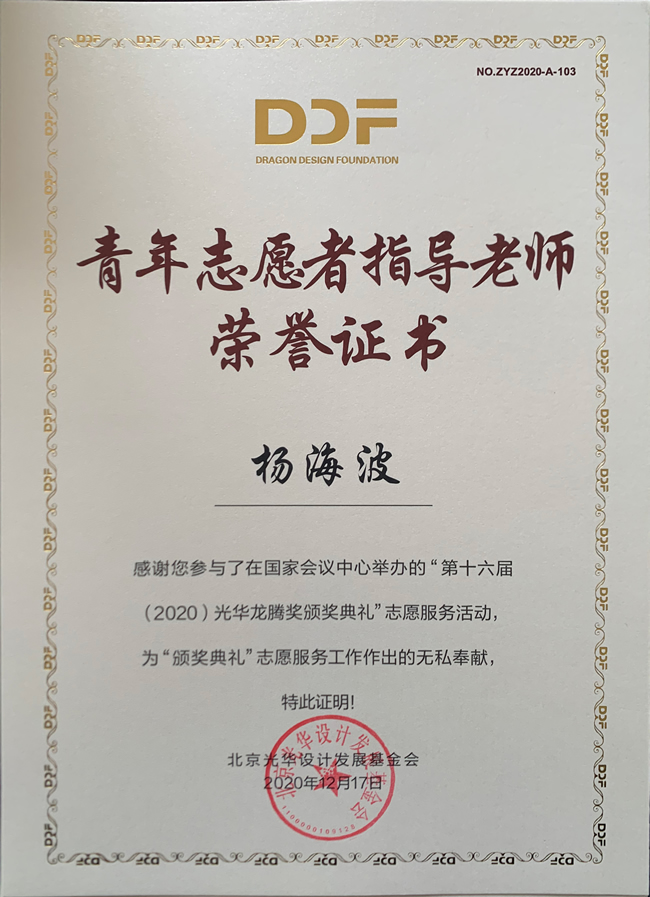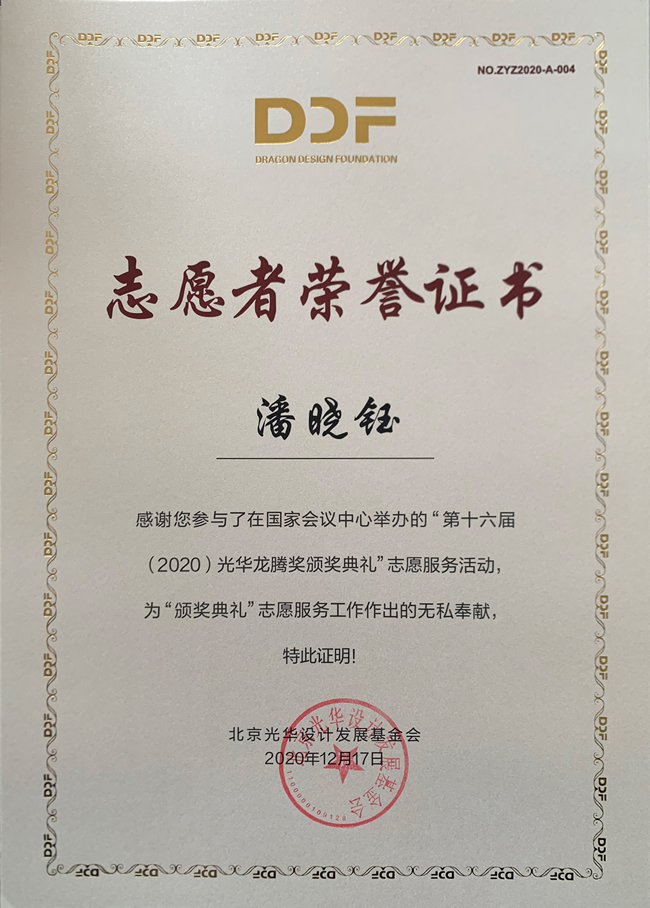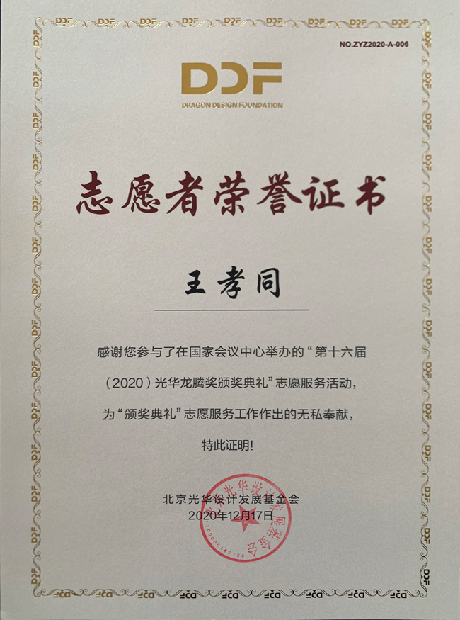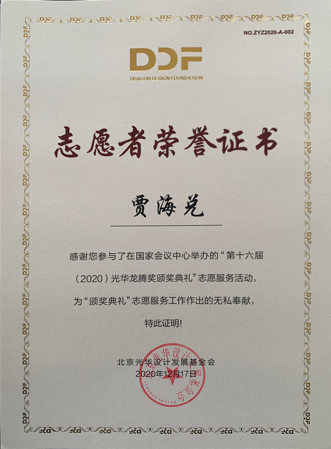 2020年12月17日上午,第十六届(2020)光华龙腾奖颁奖典礼在国家会议中心隆重举行。万象城awcsport官网万象城awcsport官网荣誉院长柳冠中被授予“光华龙腾奖委员会荣誉主席”称号。万象城awcsport官网杨海波老师指导的“光华-万象城awcsport官网志愿服务队”为北京光华设计发展基金会相关活动作了大量设计志愿服务工作,得到组委会高度肯定并获颁志愿者荣誉证书。