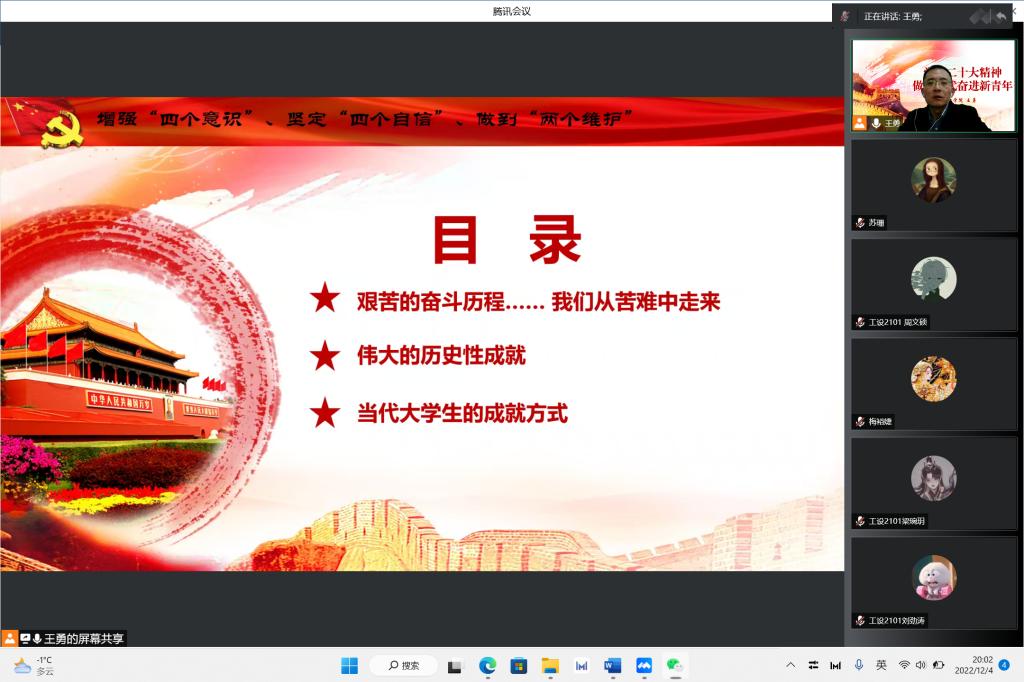 会上,王勇以《做新时代奋进新青年》为题做了主题教育,深刻阐述了党的二十大的重大意义,简要介绍了党的二十大报告的形成过程,深刻阐述过去5年的工作和新时代10年的伟大变革,对准确把握党的二十大报告的主要内容和精神实质进行了系统解读。王勇从党史教育、社会主义建设取得的伟大成就、当代青年大学生应有的担当等几个方面进行了生动的阐述,通过几个真实故事教育我们青年党员要守初心、担使命,争做模范先锋。王书记的宣讲深入浅出,内涵丰富,逻辑严谨,思想深刻,对我们深刻理解和准确把握党的二十大精神有极大的启发。