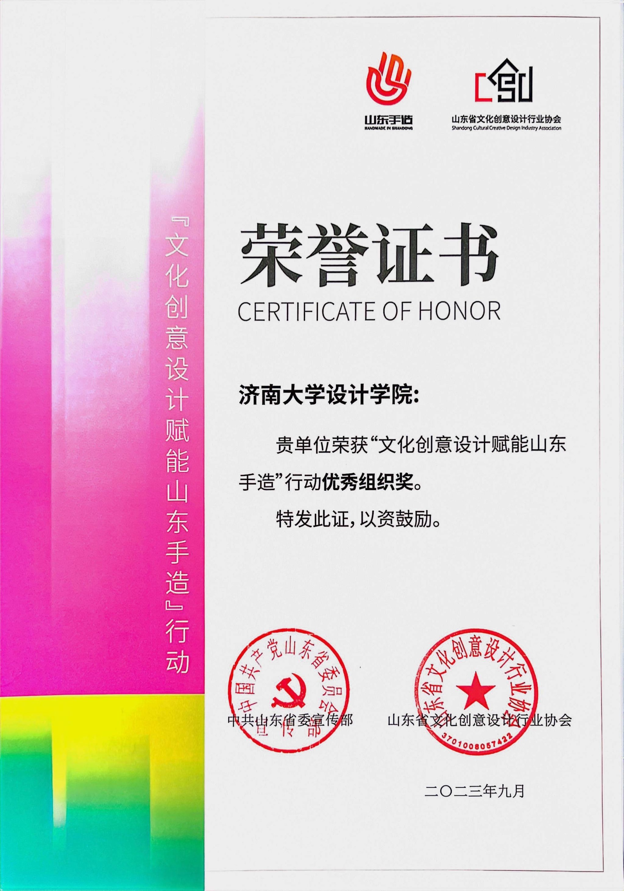 近日,由山东省委宣传部主办,山东省十六地市委宣传部和山东省文化创意设计行业协会共同承办的“文化创意设计赋能山东手造”行动赋能团队颁奖活动举行。我校万象城awcsport官网副院长杨海波所率团队深入各地非遗工作室、文创企业开展系列公益宣讲、专题培训、设计工坊并结合访企拓岗等活动,以其良好的各界反响获颁“优秀组织奖”。