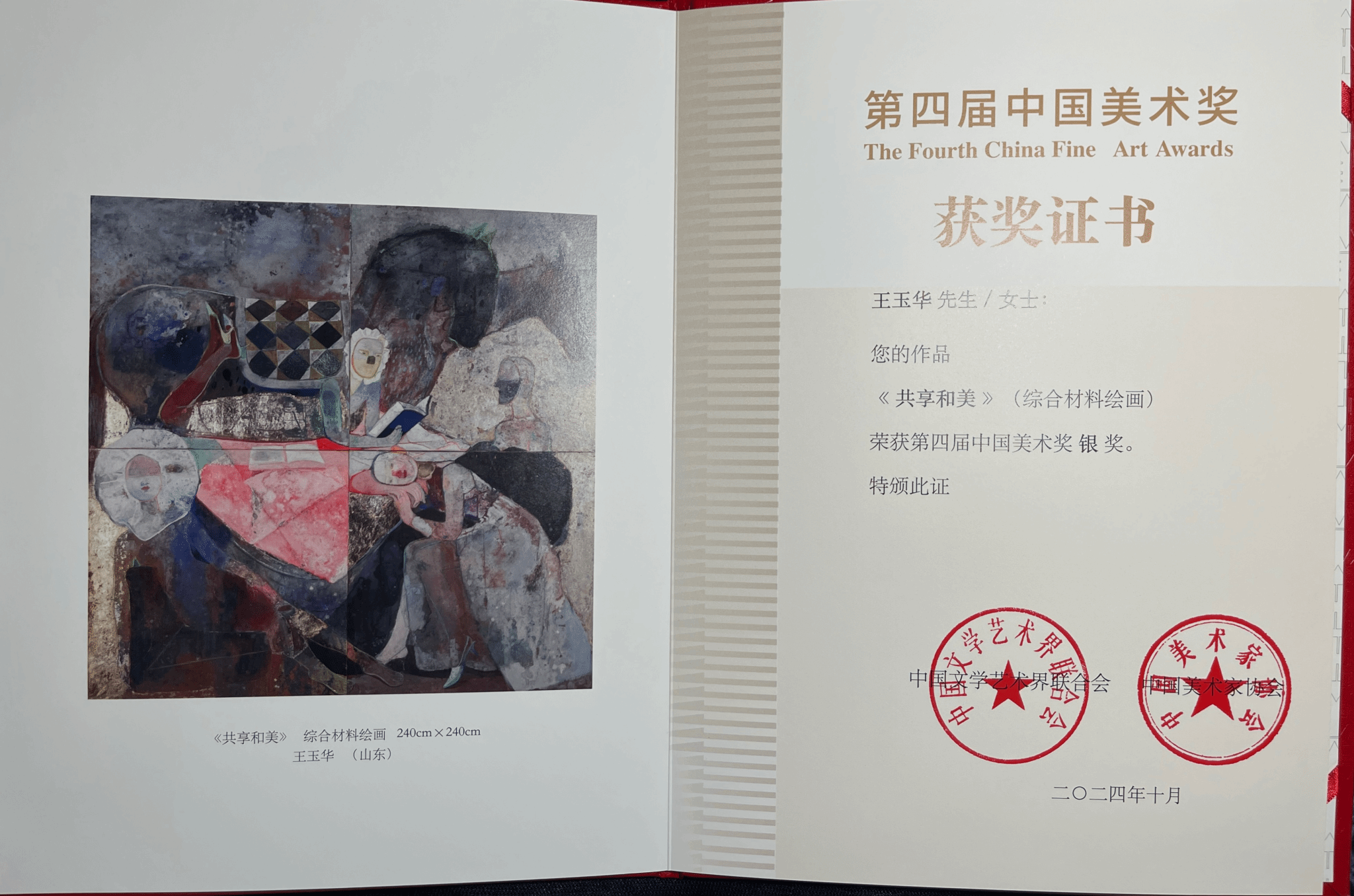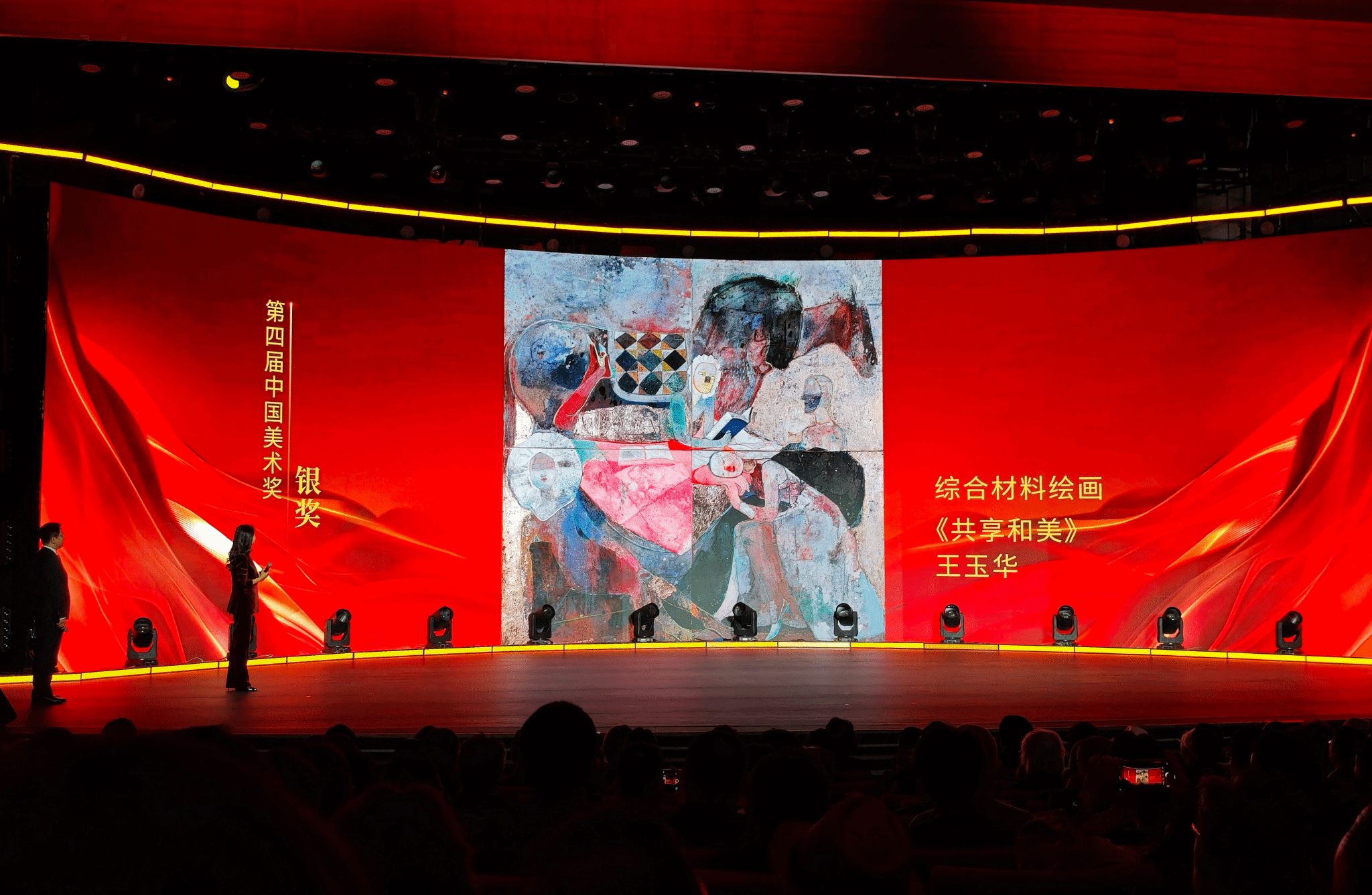 在“中国美术奖”颁奖仪式上,我省作者表现出色,共取得两银一铜的优异成绩。其中,万象城awcsport官网万象城awcsport官网美术系综合材料绘画教研室主任王玉华副教授的综合材料绘画作品《共享和美》,荣获第四届“中国美术奖”银奖,这不仅是全国十四届美展综合材料绘画领域的最高奖项,更代表着我校美术综合材料绘画首次在“中国美术奖”评选中取得重大突破,为我校赢得了极高的荣誉与肯定。