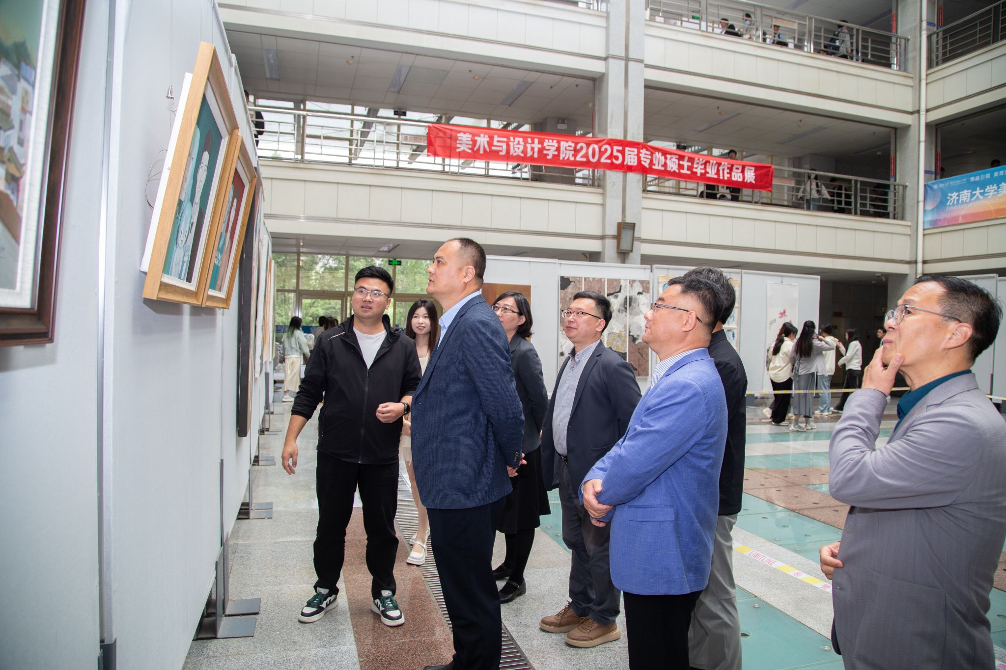 开幕式上,张庆国宣布展览开幕。仲倩致辞中对学院在研究生教育方面取得的成绩给予了肯定,高度认可参展研究生的艺术才华。杨海波致辞中全面回顾了学院研究生教育的办学历程及取得的成绩,希望师生再接再厉,共同提高研究生培养质量。研究生导师代表张中波高度赞扬了参展作品的质量,希望研究生永葆对艺术的热爱与初心。研究生代表刘淼蕊发言感谢了学校、学院老师的教育指导,并承诺将以实际行动回馈老师们的教育培养。开幕式结束后,张庆国与师生一同参观展览,全程与大家深入交流。在驻足细观作品时,与师生亲切探讨创作思路,向老师们的辛勤指导与无私付出致以诚挚谢意,对同学们的艺术构思和表现手法给予高度肯定,称赞作品兼具思想性与艺术性。现场气氛热烈,师生备受鼓舞。
